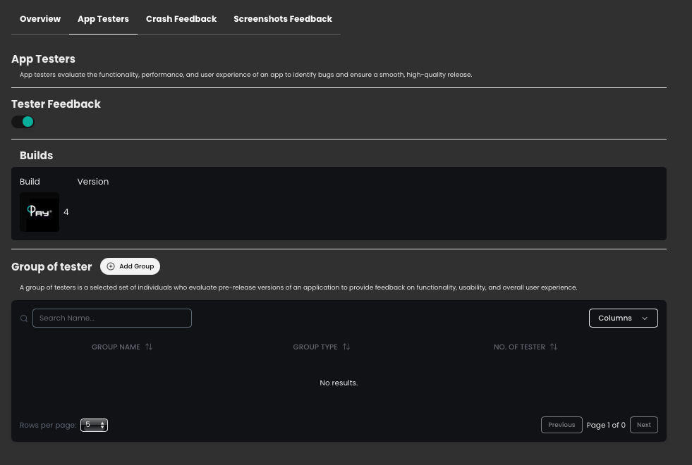 The Testers tab allows you to manage and review app testing activities. It includes: